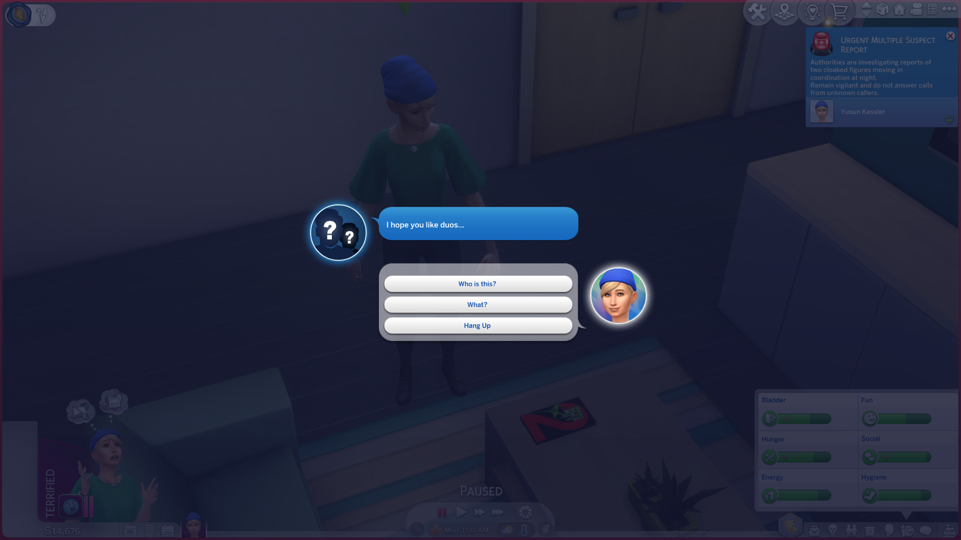 - You can trigger the phonecall that summons the Ghostface Duo by clicking on your sim > Nights Of Terror > Ghostface > Read Urgent Multiple Suspect Report.